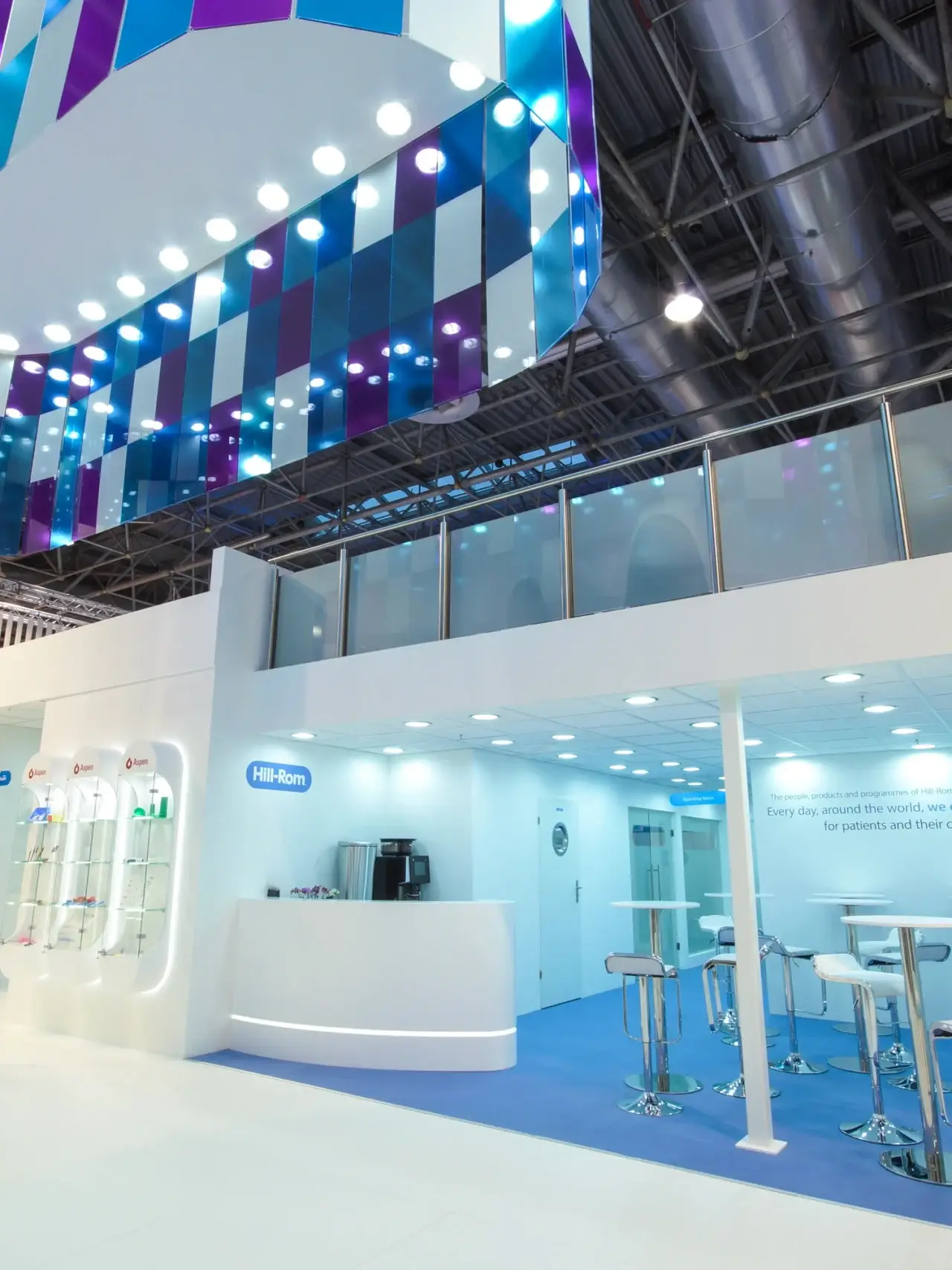 The result was a sleek, double-deck stand that felt entirely immersive. Nine demo rooms were designed to replicate hospital environments, such as operating theatres and ICUs, where Hillrom’s advanced technologies were fully operational. Digital touchscreens provided visitors with an interactive product experience.