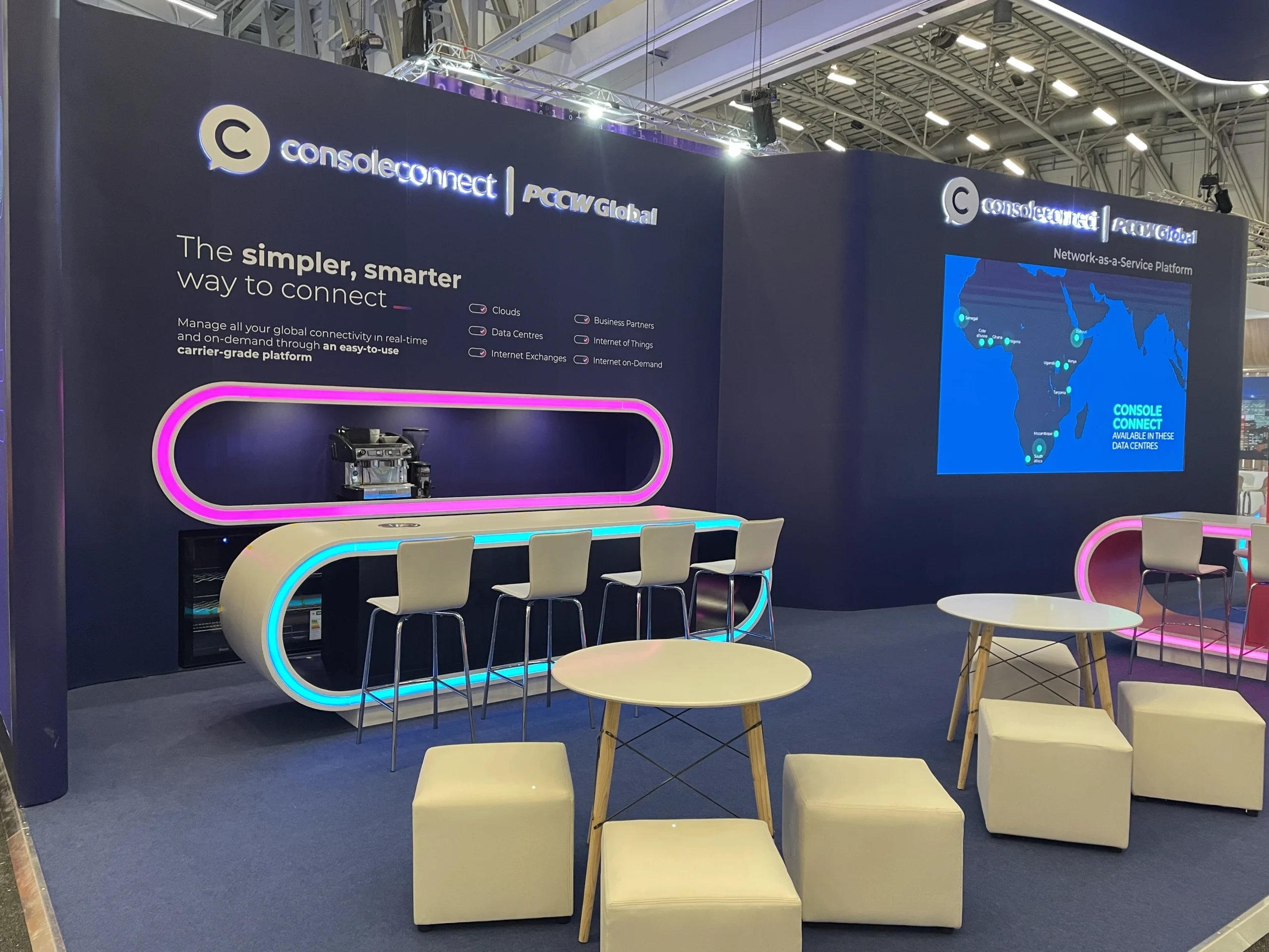 A striking 3m x 2.5m LED screen served as the centrepiece, drawing attendees and dynamically showcasing the NaaS platform’s capabilities. Surrounding the screen, a streamlined demo station enabled visitors to interact directly with PCCW Console Connect’s offerings, guided by knowledgeable representatives. High-quality materials and meticulous finishes were selected to exceed local standards, underscoring the brand’s dedication to quality and excellence.
