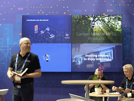The stand’s centrepiece featured dynamic digital displays that demonstrated Vitec’s award-winning solutions, set against a wall that evoked a futuristic cityscape in Vitec’s signature deep blue. Visible from across the hall, an overhead banner displayed the Vitec logo, enhancing brand visibility. The layout included glass partitioning along one side, inviting attendees in from the walkways, and the stand’s interior maintained a minimalist design with clean lines, chrome accents, and modular demo stations to showcase products.
