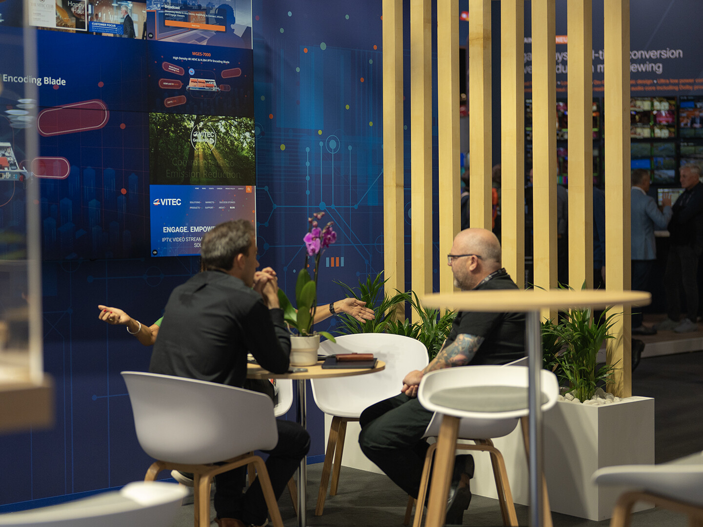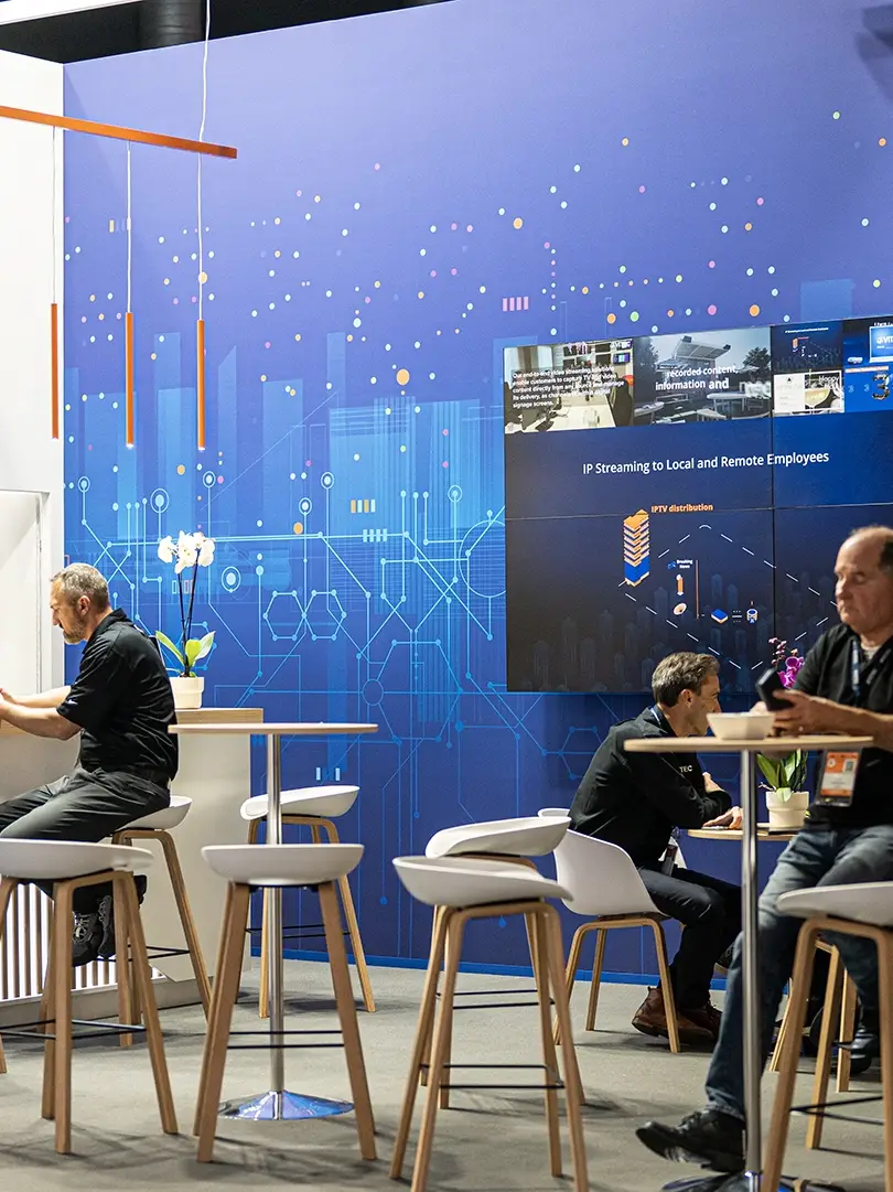 DSA conceptualised a space optimising Vitec’s 62 square feet, combining meeting and coffee areas with engaging wall-mounted screens. Every detail was designed to reflect Vitec’s brand while providing a functional, adaptable solution that would work seamlessly at future events.
